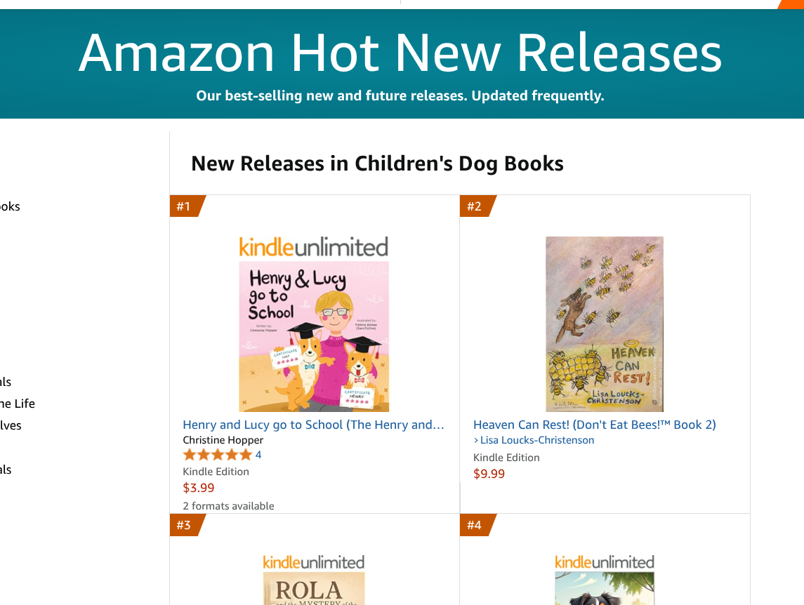 Don't Eat Bees! by Lisa Loucks-Christenson was released on December 23, 2019, and by January 2020 it had become a #1 Amazon Hot New Release in Children's Dog Books. The listing specifically notes: "Launched and hit #1 Amazon Hot New Release Children's Dog Books ... as of 1/11/2020 8:43 AM"1.