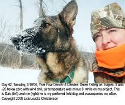 Lisa trained Dale to sit for hours in the woods alongside her, while she worked on her bald eagle documentary (above photo). Dale learned how to unzip her bag and get his own water bottle. Why drink the creek when spring water is readily available in Lisa's work a bag? Once, he had to retrieve her hat that he'd sneaked off with and left in the woods––a half mile away at their last stop. On Dale's 14th birthday, Dale didn't snap up his steak, he knew not to touch his t-bone steak sitting on the plate at his feet until Lisa was ready to take his picture. Lisa says that Dale could be trained to do anything that didn't interrupt his favorite pastime of chasing and snacking on bees. Dale was never stung.